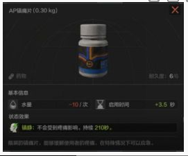 AP镇痛片的耐久是6点,镇静时长持续210秒,启用时长3.5秒,减少自身水量10/次。