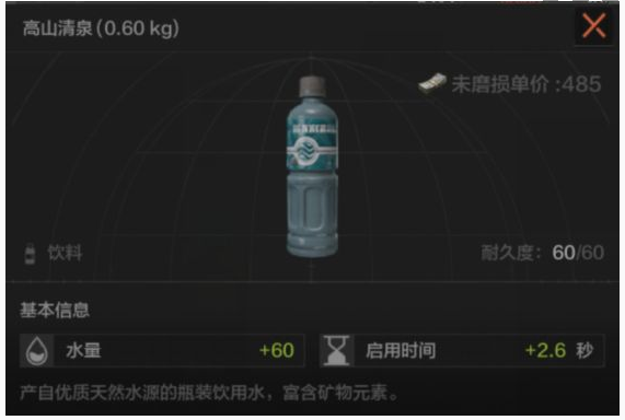 这款饮品可以说是入门级的了,它的耐久度是60点,饮用后水量加60,启用时长是2.6秒。
