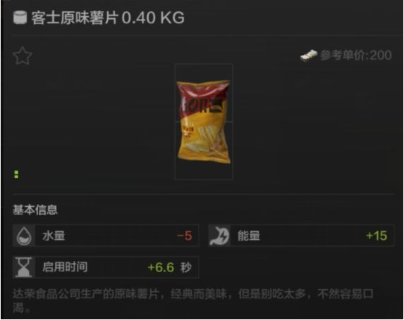 客士原味薯片在食用后水量减5,能量加15,启用时长是6.6秒。