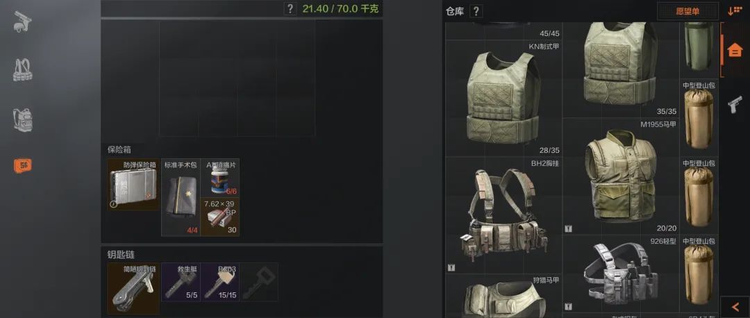 在行动模式中,保险箱可用于存放重要的任务物品和一些比较值钱的物资,即使大家在对局中失手成盒,放在保险箱内的东西也不会丢失。老皮我比较喜欢在入场前往保险箱里塞上一些重要的补给类物资,比如可使用多次的手术包、止痛片、耐力药剂、高级子弹等。这些物资一般会在战后整备阶段使用,因此没必要提前放在弹挂里。尤其是高穿透等级的子弹,往往一颗就上百柯恩币,直接放在弹挂中未免有点太亏。