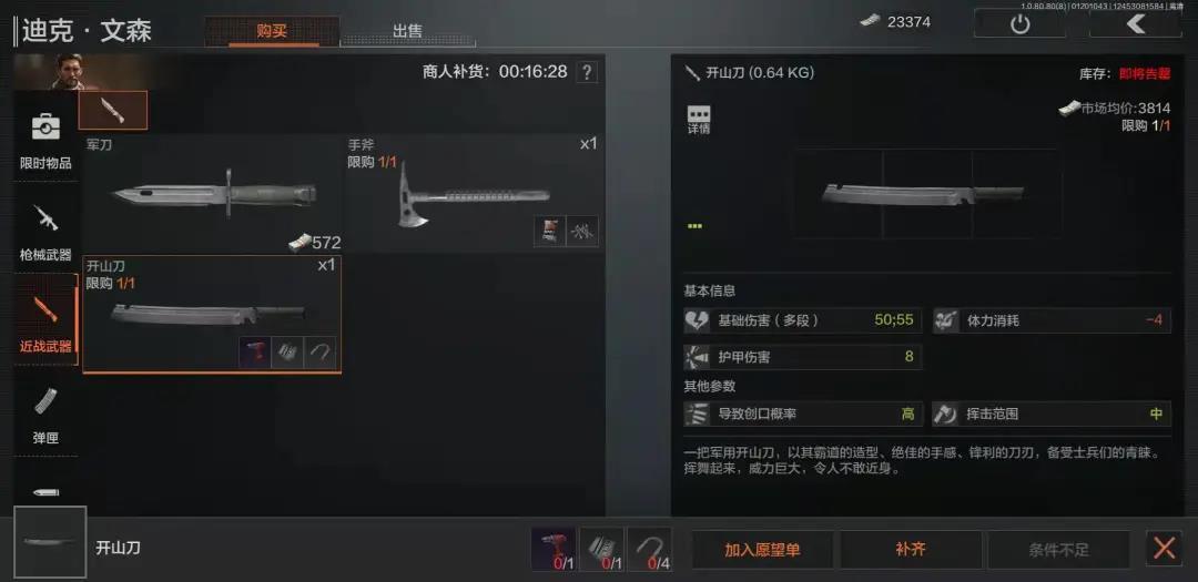 迪克售卖的物品中,比较有特色的有两类,其一是各种大小不等的背包,前期如果没背包了,可以来这里花点小钱买一个轻型或中型包;另一个则是近战武器,虽然老玩家们常说“跑刀”,但来迪克这里拿物资把你的小匕首换成***,跑刀成功率肯定高得多。