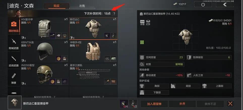 迪克同样会售卖一些武器,好感度提高后能换到M14、Mini14这样性价比较高的半自动步枪和对应的配件、子弹。另外,不同于其他联络人只有固定贩售的物品,迪克这里还会有一些在每天6点、12点、18点定时刷新的限时物品兑换,有可能刷出其他联络人处无法兑换的物品,比如6级防弹的防弹衣,推荐大家平时多关注下,不要错过“捡漏”的机会。