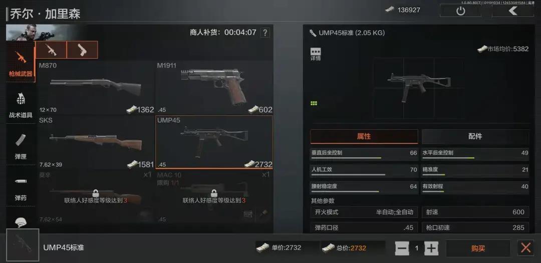 首先是1级就能解锁的乔尔·加里森。作为带领大家走完新手教程的训练教官,大家跟他打交道的机会可不少。乔尔的联络人任务大多是在农场地图执行的探索类任务,难度不大,奖励可观,可以优先完成。乔尔出售的物品种类也十分丰富,武器、装备、子弹到容器箱应有尽有。这里告诉大家一个规律,卖枪的联络人,往往会卖对应枪支能使用的子弹、弹匣和一些基础改装配件。比如乔尔在到达二级好感度后会出售UMP45,我们就可以从他这里买到UMP45所使用的各类.45口径的子弹。