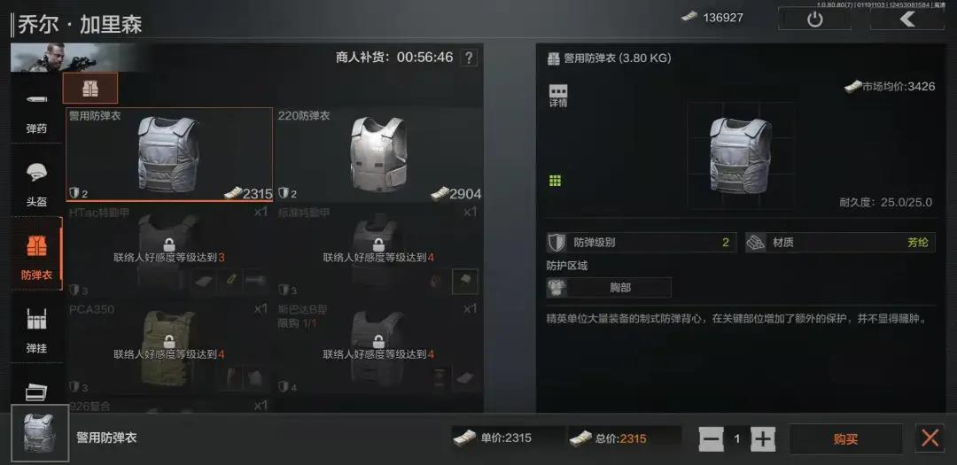 装备方面,在乔尔这里能买到各种各样的低级防弹衣和弹挂,前期如果失手成盒,不妨来乔尔这里看看能不能再花点小钱凑出一套装备。