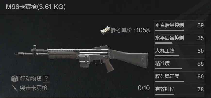 M96是暗区中另一把入门级突击卡.宾.枪,只不过使用的是AR枪族通用的5.56x45毫米子弹,因此单发威力不如Hunter。先锋们在潜入模式中,偶尔会随机到配有瞄具的M96,由于后坐控制和腰射稳定度尚可,射速也有400发/分钟,在伪装时还算比较好用。但是除了瞄具和弹匣之外,M96无法加装其它配件提高属性,因此注定只是一把前期武器。