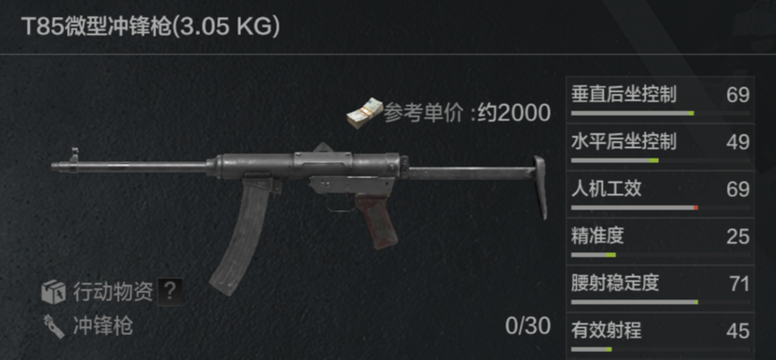T85是T79冲锋枪的升级版,同样使用7.62x25毫米口径子弹,属性相对有所提升,并保留了视野清晰的机瞄准星。T85可改装的部件不多,不过在替换原厂枪管为微冲枪管后,虽然会降低有效射程,但可以给枪口加装专用消音器提高隐蔽性,将照门拆下换为T85导轨后也可以装瞄具。总体而言T85是一把初期很好用的冲锋枪,不过子弹类型还是限制了它的上限。