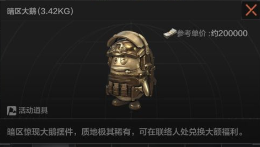 介绍:暗区惊现大鹅摆件,质地极其稀有,可在联络人处兑换大额福利。