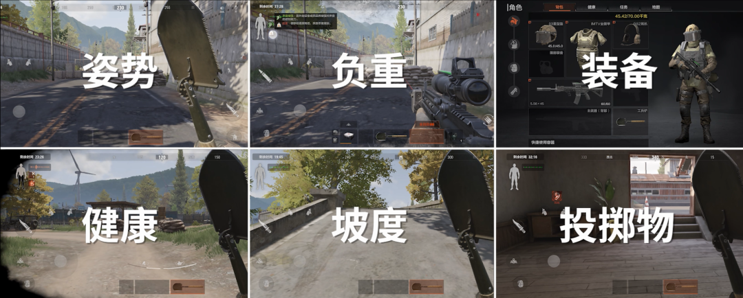 影响移动速度的因素共有六种:人物姿势、是否超重、人物装备(护甲和主武器)、腿部状态、地面坡度和是否受震撼弹影响。