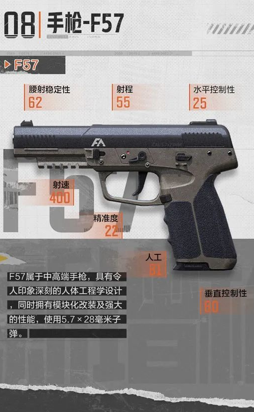F57是一把使用P90同款5.7*28毫米子弹的强力手枪,由于新版本为5.7*28毫米子弹新增了5级穿透的弹种,让这把手枪的威胁度同样不俗。60的垂直后坐控制,81的人机工效和55的有效射程在手枪中名列前茅。可以扩容至20发的弹匣,让它的整体续航也是可以接受的水平。并且我们还可以通过改装枪管为它加装消音器,这是以往两款热门手枪G18C和沙鹰都没有的“特权”。加装瞄具、镭指和消音器的满改F57,毫无疑问将会成为公测版本中手枪玩家的新宠。