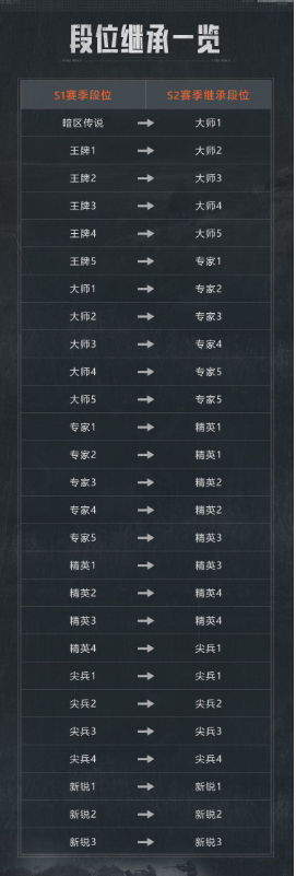 除段位、赛季手册重置外,先锋们在S1赛季所拥有的角色等级、柯恩币余额、点券余额、会员、安全箱、市场订单、邮件有效期内的物品、仓库中的所有物资、游戏好友等均可以继承到S2赛季中使用。