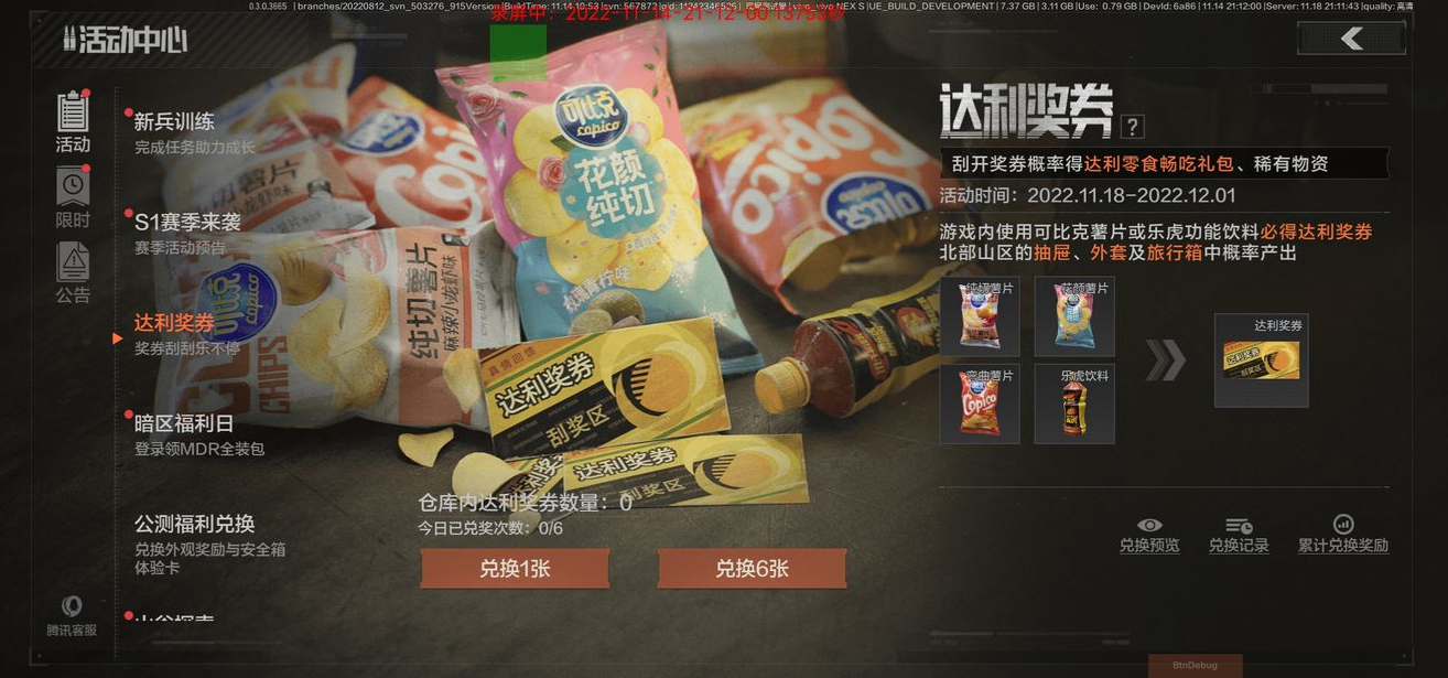 活动期间,可从北部山区的抽屉、外套及旅行箱中找到可比克薯片及乐虎功能饮料。食用任意可比克薯片或乐虎功能饮料必得一张达利奖券,于活动中心消耗奖券有概率得达利实物零食礼包及珍稀物资奖励。