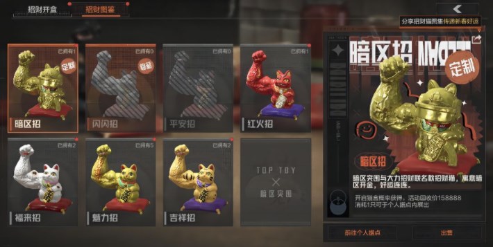 ②大力招财与暗区突围联名定制招财猫:可通过开启猫盒概率获得;