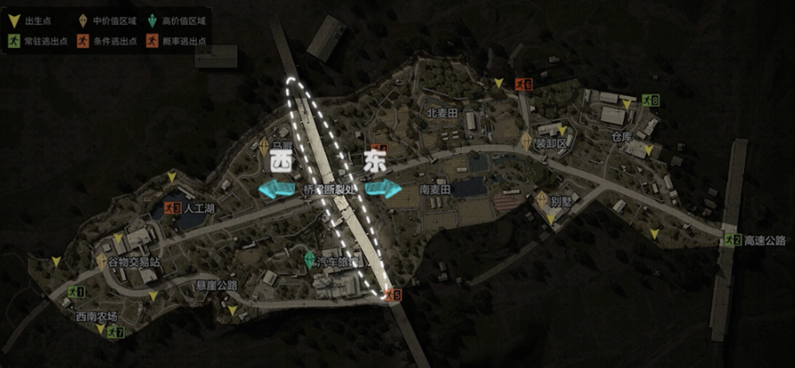 如上图所示,农场中部断裂的桥梁将农场分为东西两部分。玩家在战术行动中进入时的出生点和常驻撤离点分布在地图的东西两侧。一般来说,如果出生点在西侧,那么默认的撤离点就会在东侧,反之同理。所以先锋们不管出生在哪里,行进路线基本为“从左到右”或“从右到左”。地图中战利品价值比较高的区域有:谷物交易站、装卸区、别墅、马厩、汽车旅馆。除此之外,北麦田露天堆放处、南麦田小屋也有一些武器箱和抽屉可以搜索。