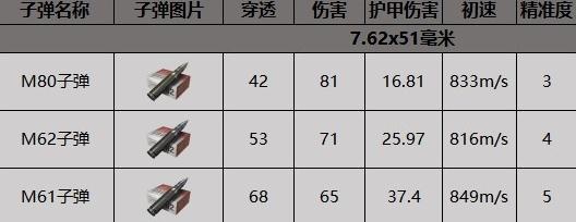 M61子弹是高级子弹之一,穿甲能力为68,对无护甲目标的伤害为65。