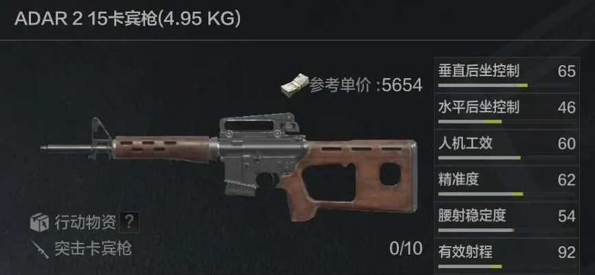 开火模式:半自动弹药口径:5.56x45射速:300有效射程:92米子弹数量:10发(默认)/20发/30发/40发/60发/100发获取方式:局内搜索/游荡者掉落/市场购买