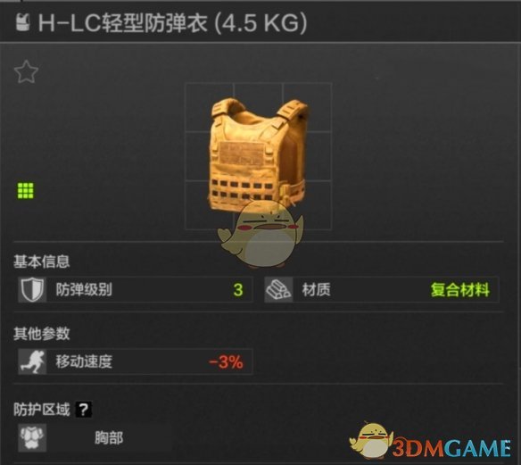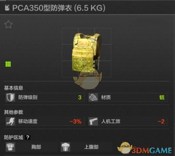 55耐久,胸部防护,山谷地图麦道格人机身上产量不低,比前两位耐久更高,同时硬度会更好一些,是比较推荐的三级轻甲。