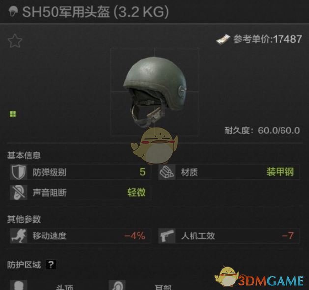 60耐久,头顶耳部防护,轻微声音阻断,最高加装三级面罩,挺好个装甲钢头盔如果能装更高级的面罩就好了。