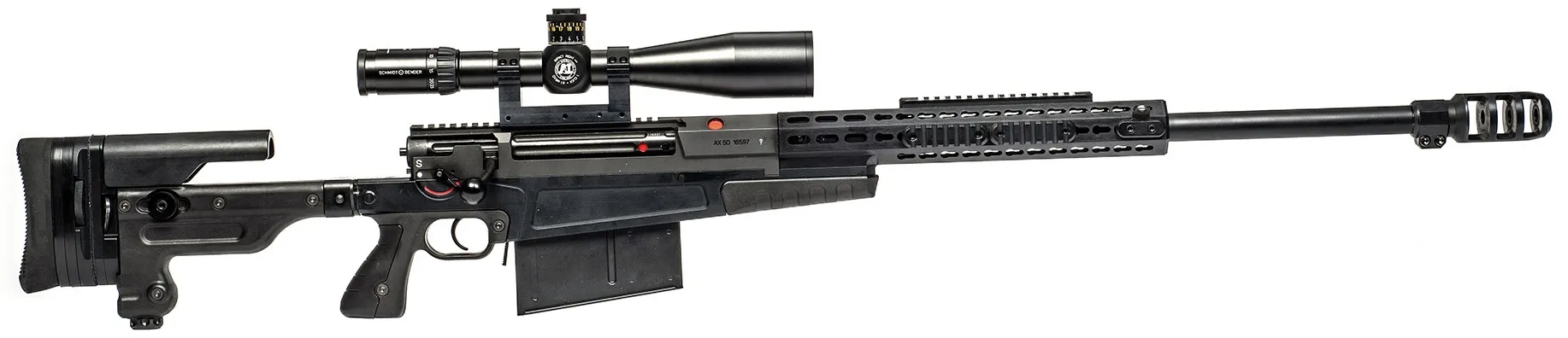 而AX50最早是在AX 338的基础上,扩大口径以发射.50 BMG(即12.7x99mm口径)子弹的反器材狙击步枪。AX50的尺寸与旧的AW50接近,但重量却大幅减轻,并且安装了大型的枪口制退器来降低.50 BMG弹药发射时产生的巨大后坐力。
