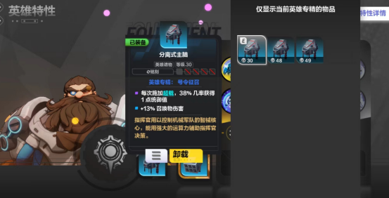 在英雄特性界面,玩家可以插入英雄遗物。英雄遗物分为分离式主脑、思维扩展坞两种,英雄遗物的属性相当强力,在刷图时会几率获得,其属性随机、数值随机,插入时可以对比之前的英雄遗物提升实力,前期有什么用什么。