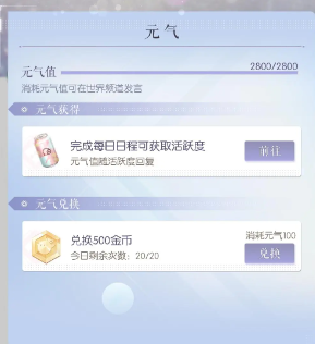 2.完成日常任务会获得大量元气(一个任务大概是200-300),后期用不完可以换金币,每天最多20次,1次100元气换500金币(聊胜于无)。