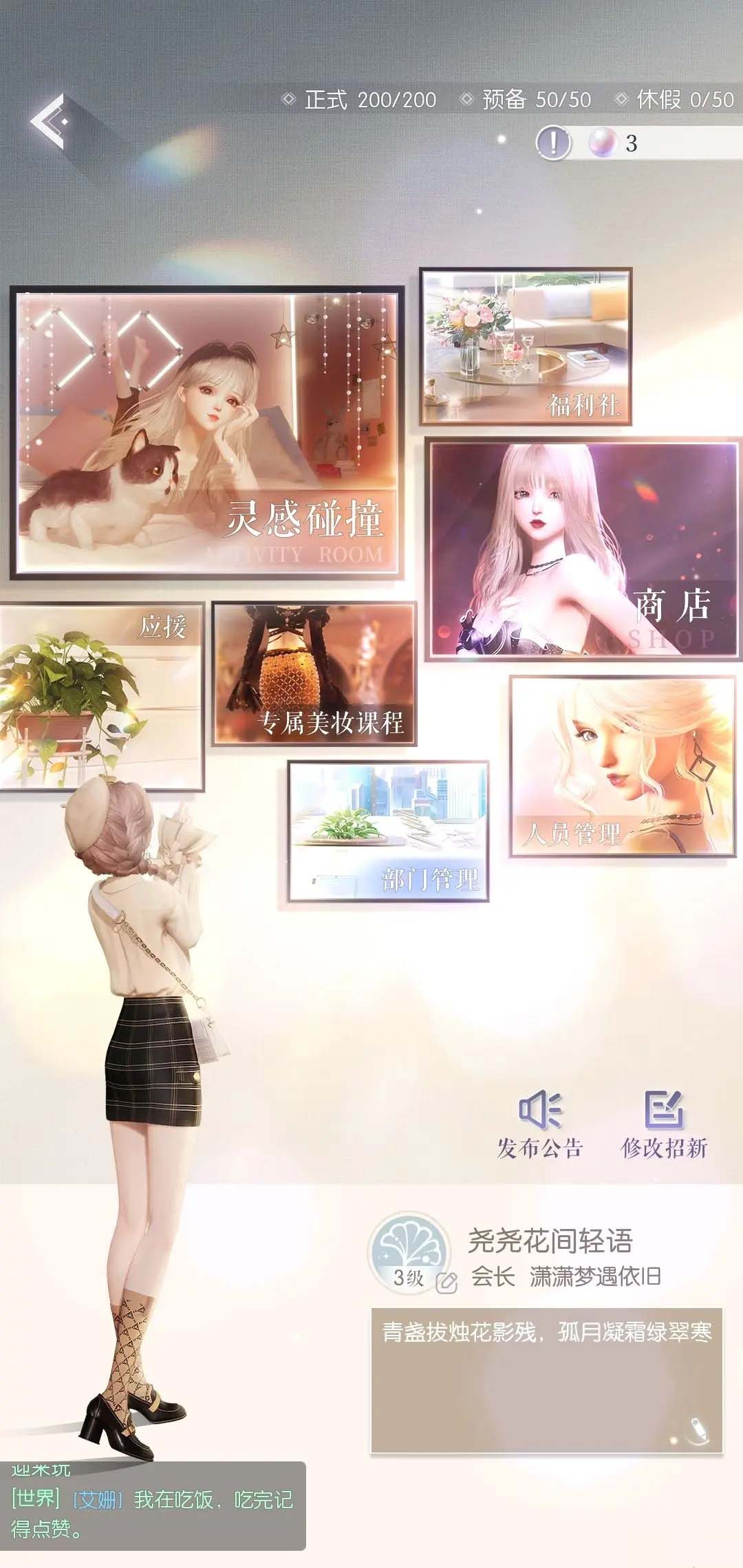 另外还有福利社,在这里玩家们可以每日领取工资,直接签字领取即可。商店的话,我们使用积分可以兑换很多的商品,服饰以及一些豪华外观,人员管理以及部门管理,这两个就是专门针对于会长以及副会长的,他们可以在这里面管理所有的成员,还有应援和专属美妆课程,应援的话,玩家们可以每日进行应援,每天三次,获取一定的积分以及经费。专属课程的话,我们直接进入个人学习,能够提升我们的美妆水平。