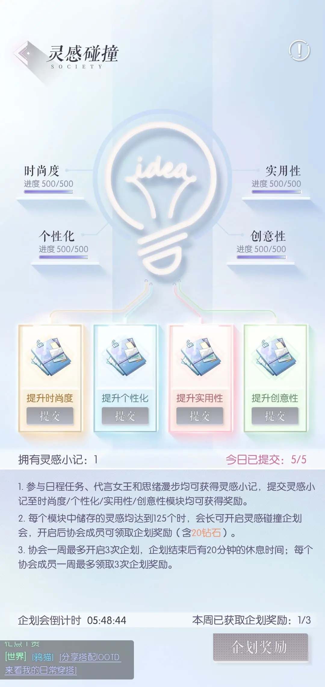 作为会长,玩家们享受到的福利待遇会更多,不过我们创建协会之后,协会的发展任务也是很繁重的,对于一些工作比较忙的玩家来说,小编还是建议大家直接申请一个协会进行体验,协会拥有很多个部门,首先是灵感碰撞,在这里玩家们可以每日进行三次灵感小计,可以提升我们的时尚度,个性度,创意度等等,