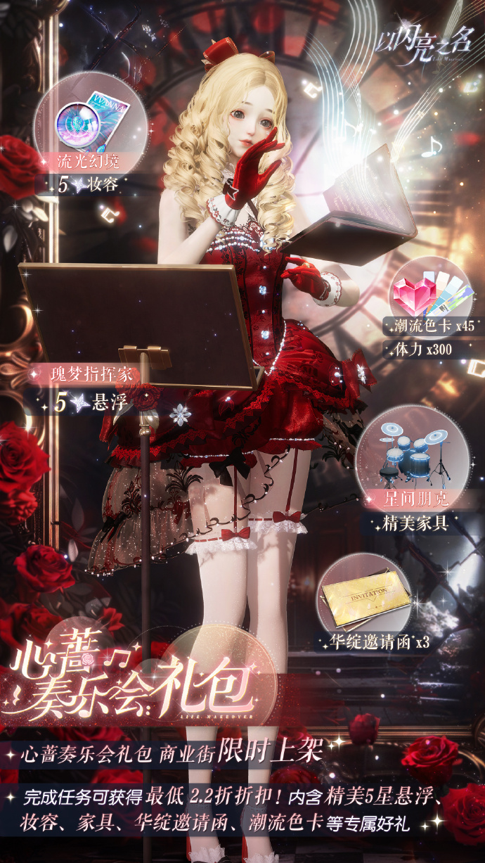 礼包售卖期间,合伙人可以完成限定任务获取礼包折扣。完成全部4个任务可降至最低折扣2.2折!超值优惠不容错过!礼包内含五星限定悬浮【瑰梦指挥家】、五星妆容【流光幻境】、精美家具【星间朋克】、华绽邀请函*3、体力*300和潮流色卡*45,该礼包永久限购1次。