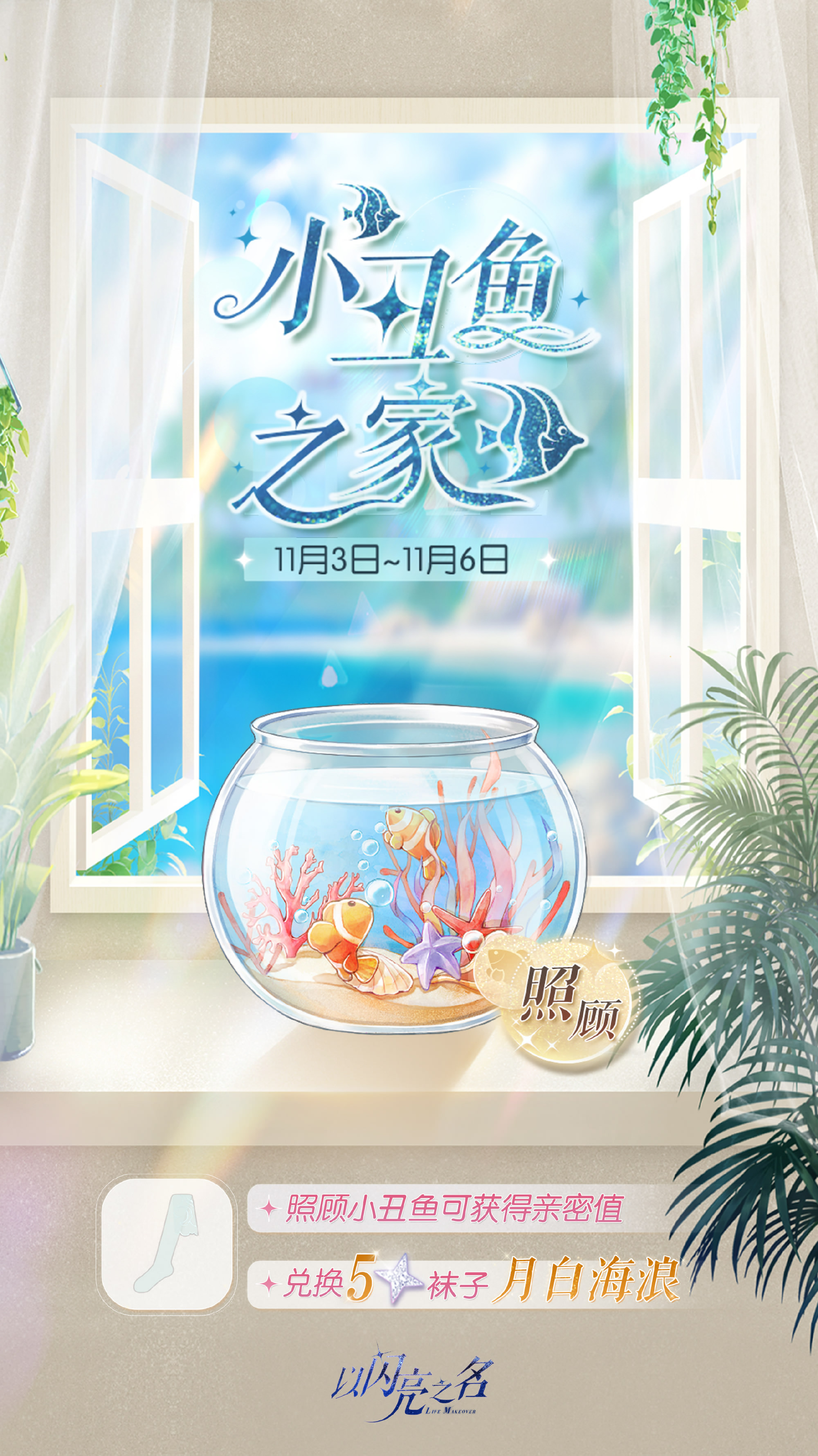 明日起光临小丑鱼之家,照顾小丑鱼有机会获得金币、基础色卡、遇之钥等奖励,累积亲密度还可领取五星时装【月白海浪】、钻石*30、潮流色卡*9及多种材料道具!