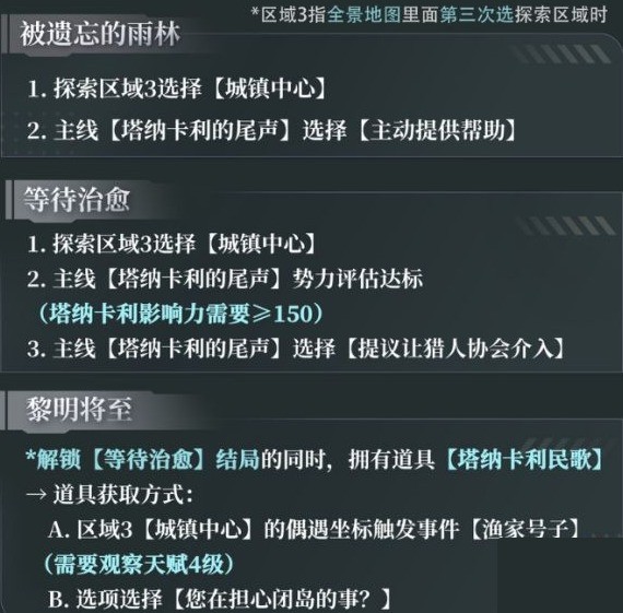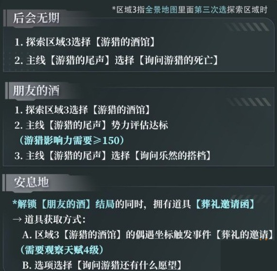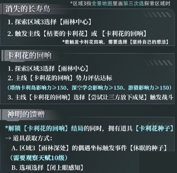 5、触发主线【卡利花的回响 】需要全部达成以下三个结局:【等待治愈(塔纳卡利岛)】、【希望正在萌芽(深空学会)】、【朋友的酒(游猎)】
