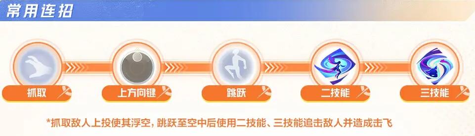 抓取敌人使其富浮空然后跳跃空中使用二技能与三技能追击敌人将其击飞。