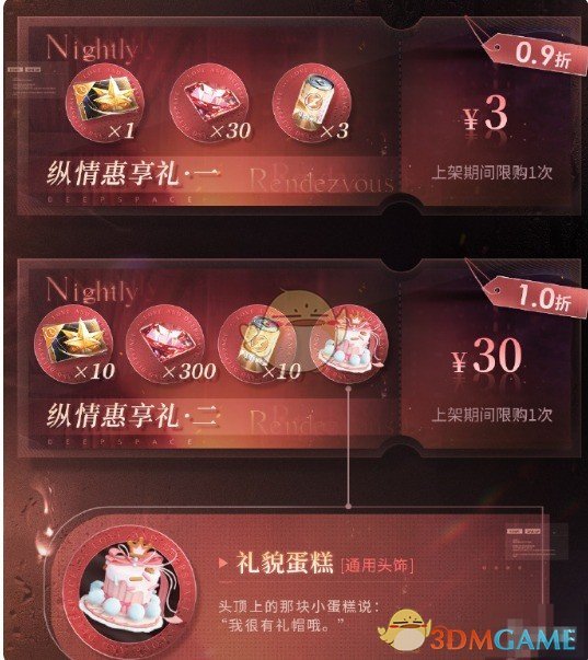 2、购买立得深空许愿券·限时*10、钻石*300、黑电能量·重磅*10、通用头饰礼貌蛋糕。