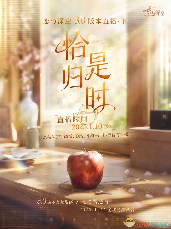 1、恋与深空3.0年度版本直播·下「恰是归时」将会在2025年1月10日直播;