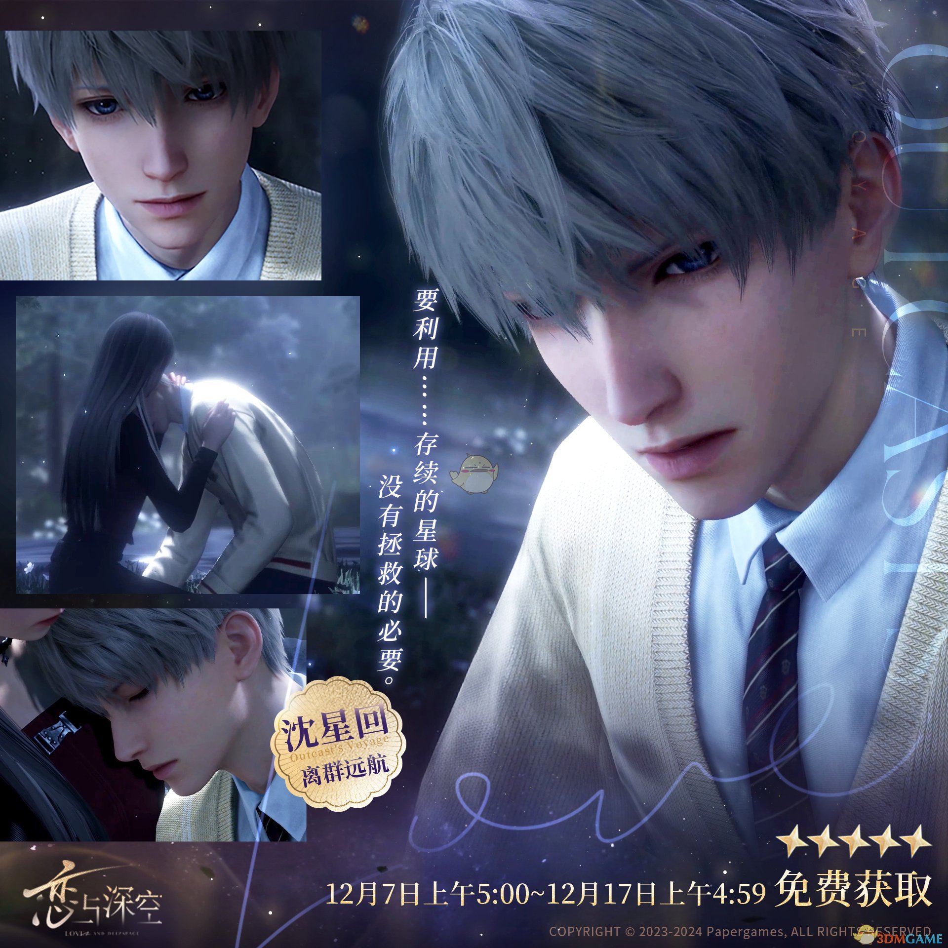 12月7日上午5:00~12月17日上午4:59,参与活动,完成全部访查任务,即可免费领取本次主线分线五星思念「沈星回·离群远航」。