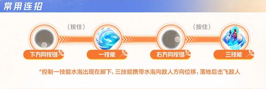 一技能水泡出现在脚下之后使用三技能携带水泡追击敌人,落地即可击飞敌人。