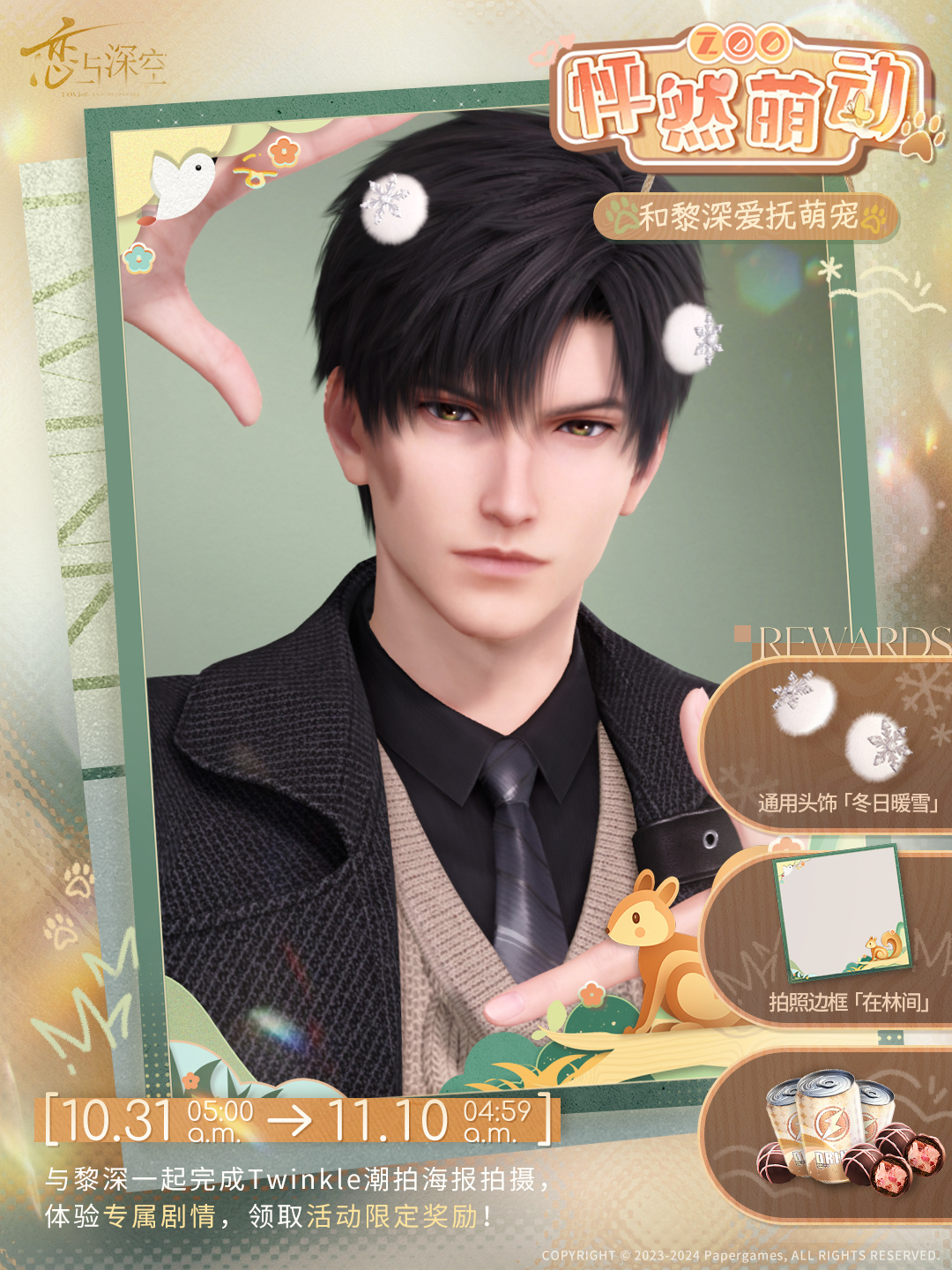 参与活动,体验专属剧情,免费获取通用头饰「冬日暖雪」、拍照边框「在林间」、黑电能量·重磅及快乐巧克力,还可解锁黎深的特别短信及朋友圈!