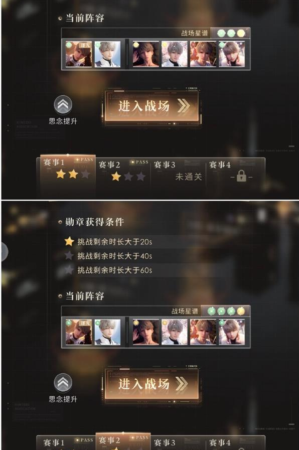 (2)如图二,只想拿赛事1的星,配队就只放置2张绿星谱,1张黄星谱,其它全按数值最高配置。想拿/有能力拿赛事2的星就再加一张绿。