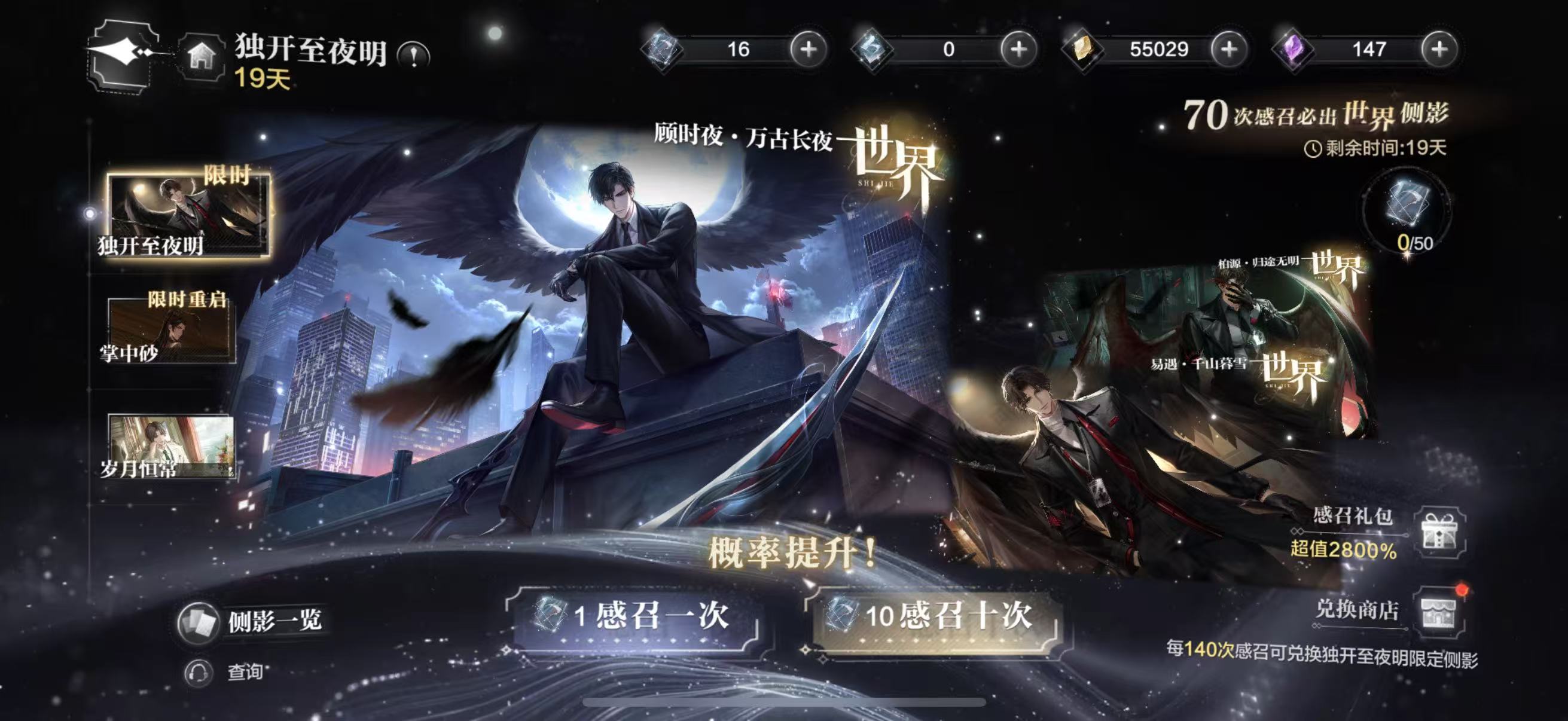 顾时夜世界侧影“万古长夜”,月光之下高楼之上,带着翅膀的西装造型十分帅气神秘;柏源“归途无名”,一段背后也有翅膀;易遇“千山暮雪”世界限定侧影;以及夏萧因的”月上黄泉”,通过每张侧影都能看出来每个男主的身份很是神秘且带感。