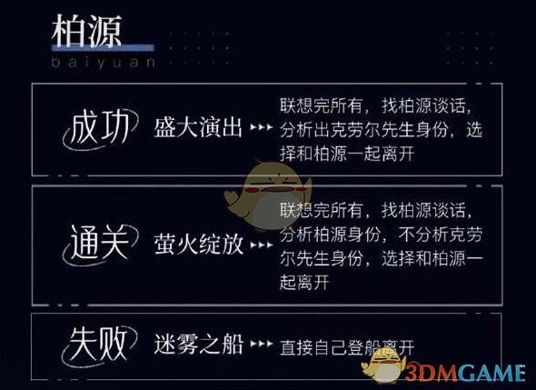 结局二萤火绽放:联想完所有,找柏源谈话,分析柏源身份,不分析克劳尔先生身份,选择和柏源一起离开,是通关结局。