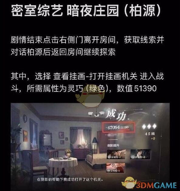 2、选择“查看挂画”进入战斗,所需属性为灵巧(绿色),数值为51390。