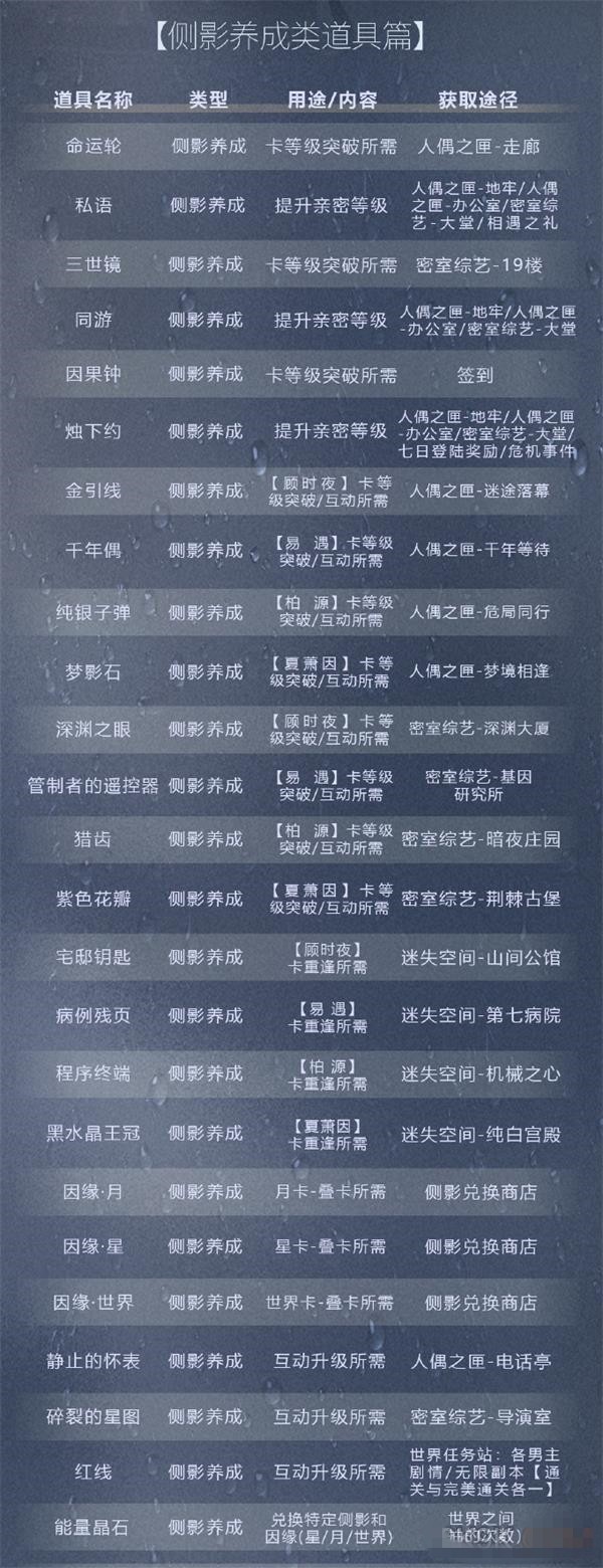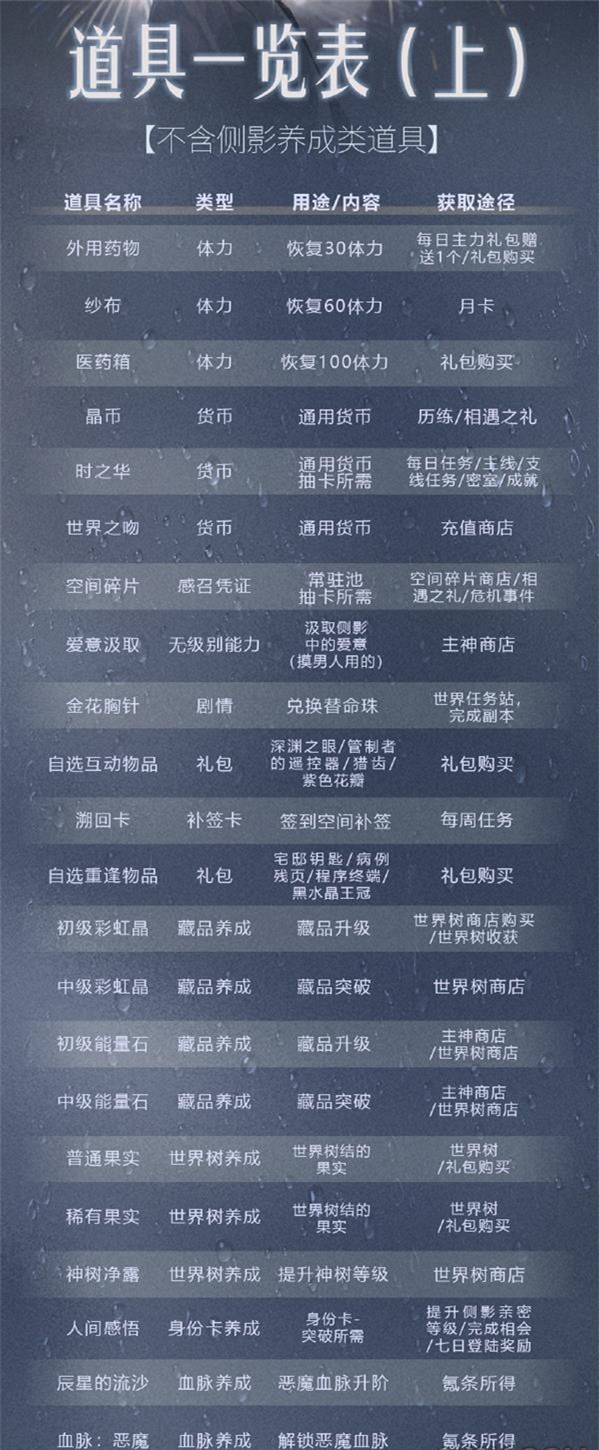 1、世界之外道具包含侧影养成类道具和不含侧影养成类道具。