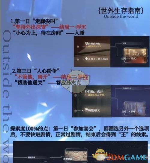 3、探索度100%的点:第一日“参加宴会”回溯选另外一个选项后,不要快进剧情,正常过剧情,结束后会得到“王”的线索。
