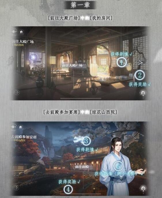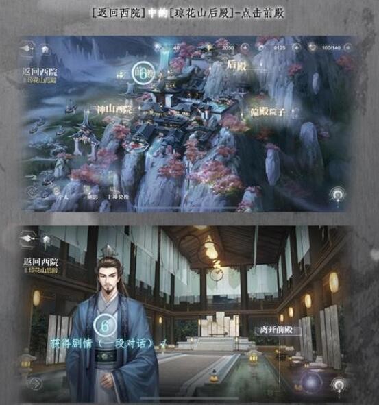 1、去前殿参加宴席中的琼花山西院,点击画面上方月亮,获得文案剧情。
