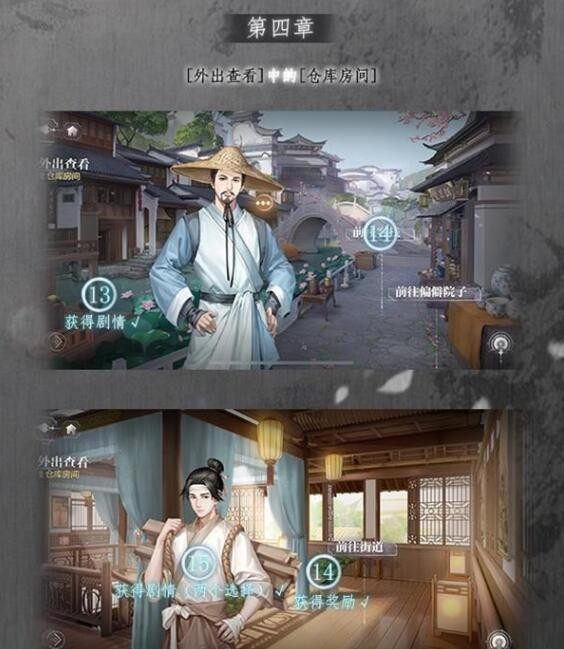 2、在城中闲逛中的客栈,前往街道,点击画面下方荷花,获得文案剧情。