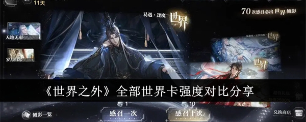 世界之外全部世界卡强度怎么样?在世界之外游戏中,玩家能够在卡池中招募到不同稀有度的卡牌进行收藏,其中世界卡也是目前稀有度最高的卡牌,那么目前都有哪些世界卡可以获得呢?全部世界卡的强度水平是什么样的呢?还不知道的小伙伴快来和小编一起看看吧。