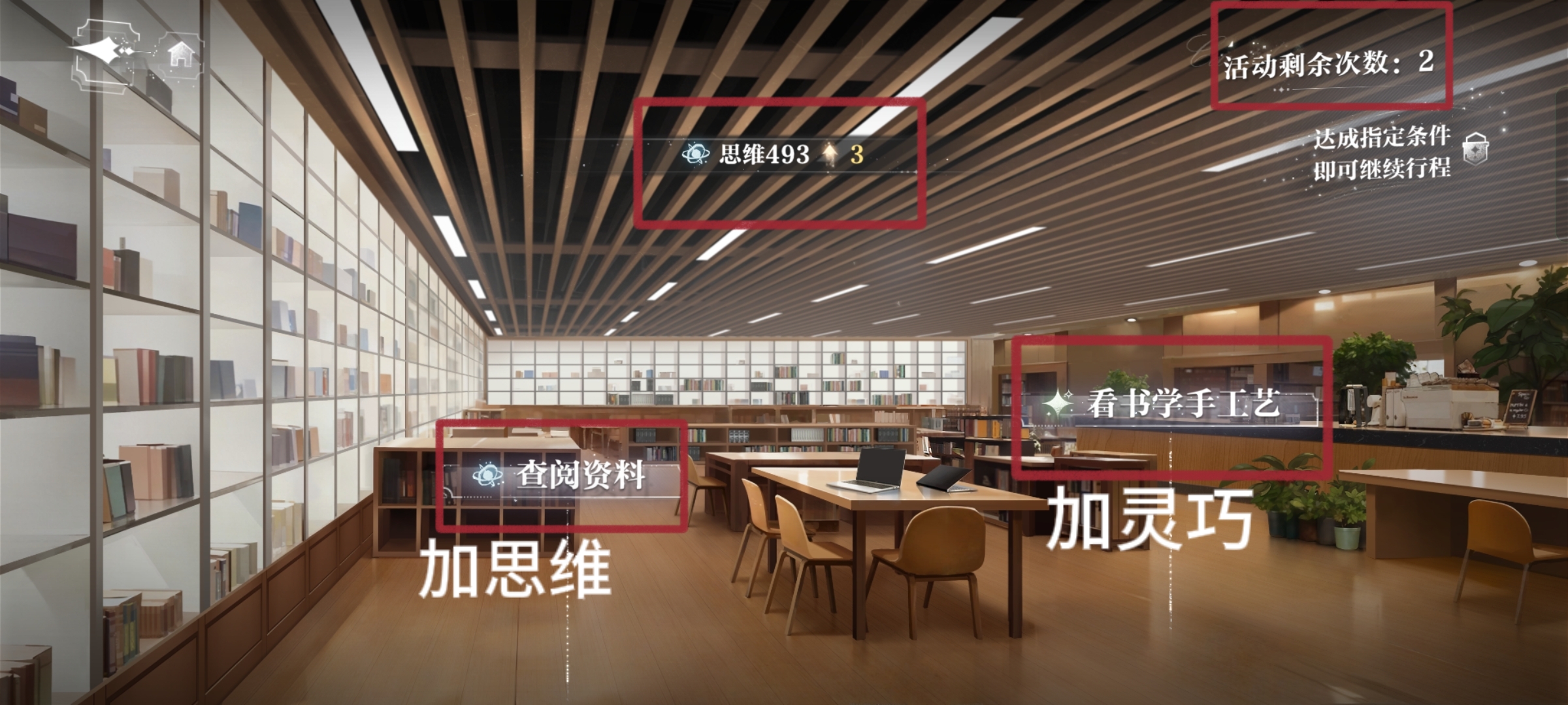 2、进入图书馆后可以看到两个选项,其中“查阅资料”可加思维,每日三次活动次数,每次加三点(此为举例,具体大家视自身情况,哪个低就去升哪个)