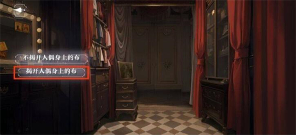 1、房间一、二不变,进入房间三。调查所有线索,再点击调查左侧桌子。选择【不揭开人偶身上的布】。