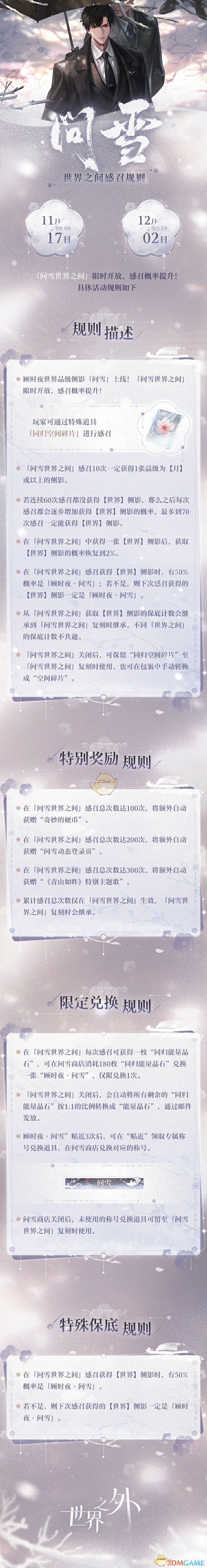 11月17日08:00-12月2日03:59,「问雪世界之间」限时开放,感召概率提升!具体活动规则如下: