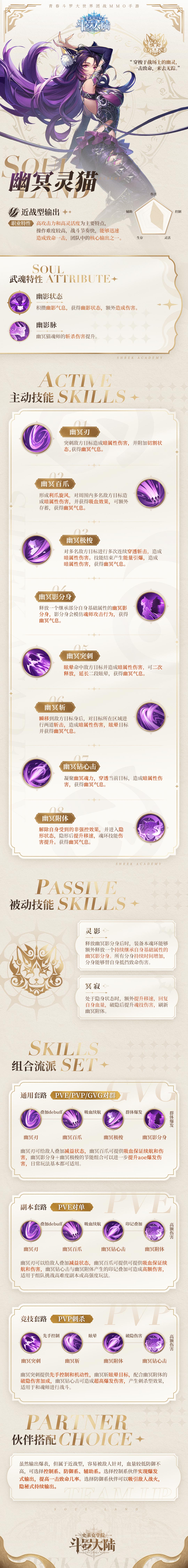斗罗大陆史莱克学院中兽武魂·幽冥灵猫是敏攻系职业,虽然输出爆表,但属于近战型,容易被敌人针对,血量较低防御不高,可选择控制系、防御系、辅助系。选择控制系伙伴实现爆发式输出,提高一击致命几率。选择防御系伙伴可以吸引敌人战火,隐秘式持续输出。接下来给大家带来了《斗罗大陆:史莱克学院》兽武魂·幽冥灵猫介绍,一起来看看吧!