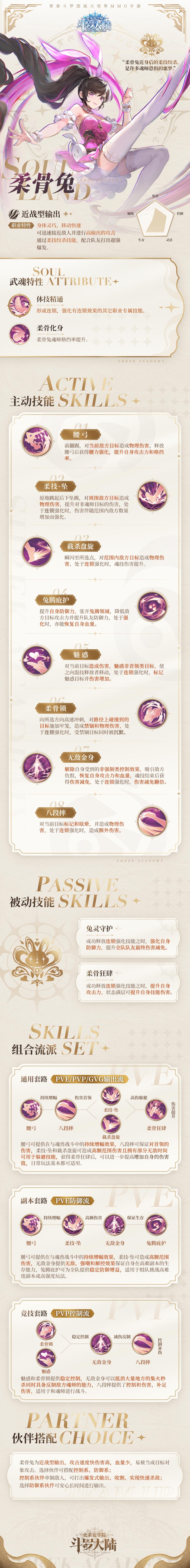 斗罗大陆史莱克学院柔骨兔为近战型输出,攻击速度快伤害高,血量少,易被当成月标对象攻击。选择伙伴可搭配控制系、防御系。控制系伙伴牵制敌人,可打出爆发式输出、收割、实现快速杀敌。选择防御系伙伴可安心长时间进行输出。接下来给大家带来了《斗罗大陆:史莱克学院》柔骨兔职业技能详情分享,一起来看看吧!