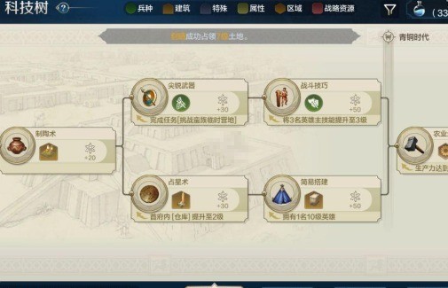 5、铁器时代后我们将下方的科技线全部点满,上面的都不点